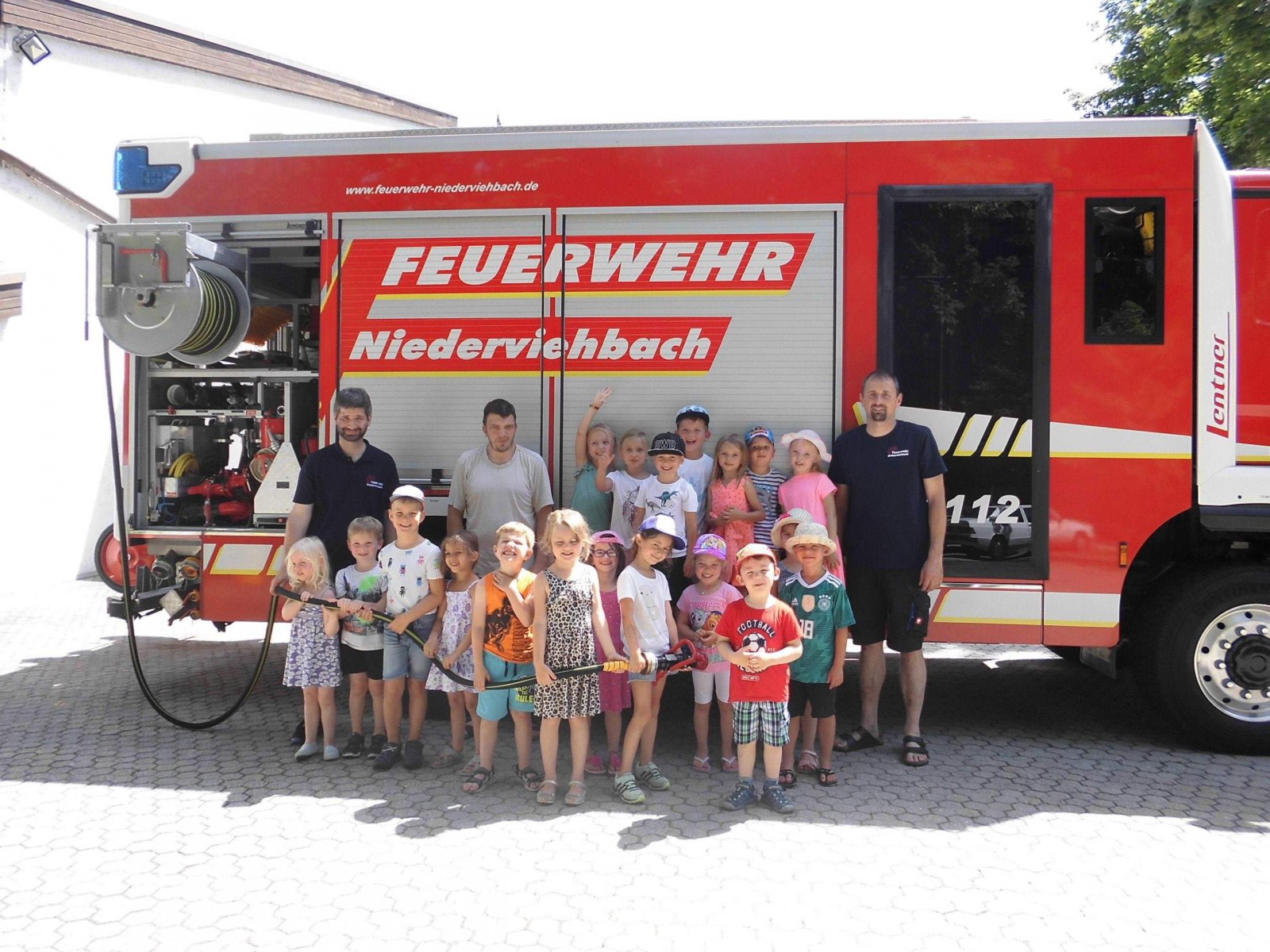 Heute waren vier Gruppen vom Kindergarten Niederviehbach zu Besuch bei der Feuerwehr. Den Kindern wurden von Erich Reuter, Fritz Wieslhuber und Stephan Neumeier das Feuerwehrauto mit Inhalt gezeigt und sie durften mit dem Schnellangriff Wasser spritzen. Zudem rüstete sich ein Feuerwehrmann komplett mit Atemschutzgerät aus, um den Kindern zu zeigen, wie ein Feuerwehrmann mit Atemschutzmaske aussieht und dass man sich davor nicht fürchten braucht. Vielen Dank an die Kameraden, die sich diesen Vormittag dafür Zeit genommen haben.