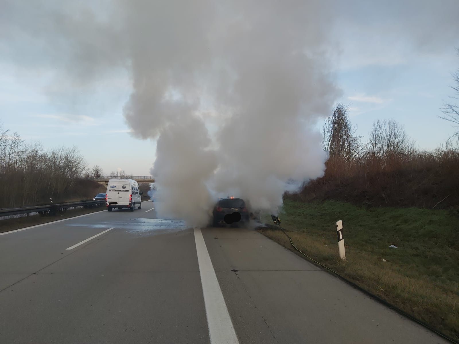 PKW in Vollbrand auf der A92 Fahrtrichtung DEG, der PKW unter Einsatz von Pressluftatmern gelöscht.