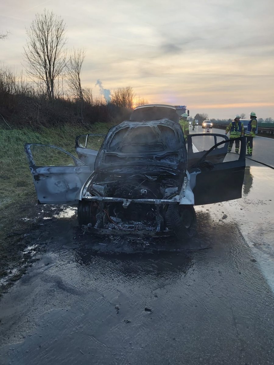 PKW in Vollbrand auf der A92 Fahrtrichtung DEG, der PKW unter Einsatz von Pressluftatmern gelöscht.