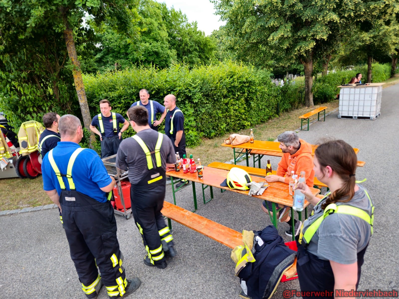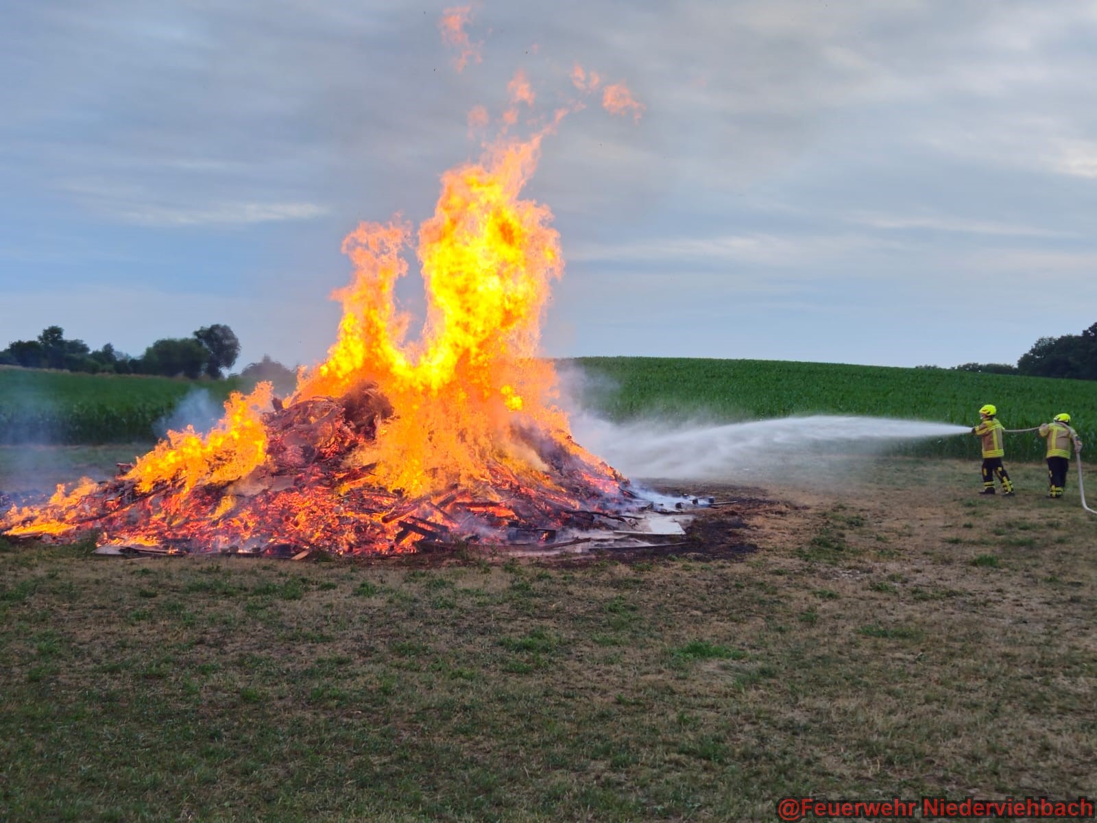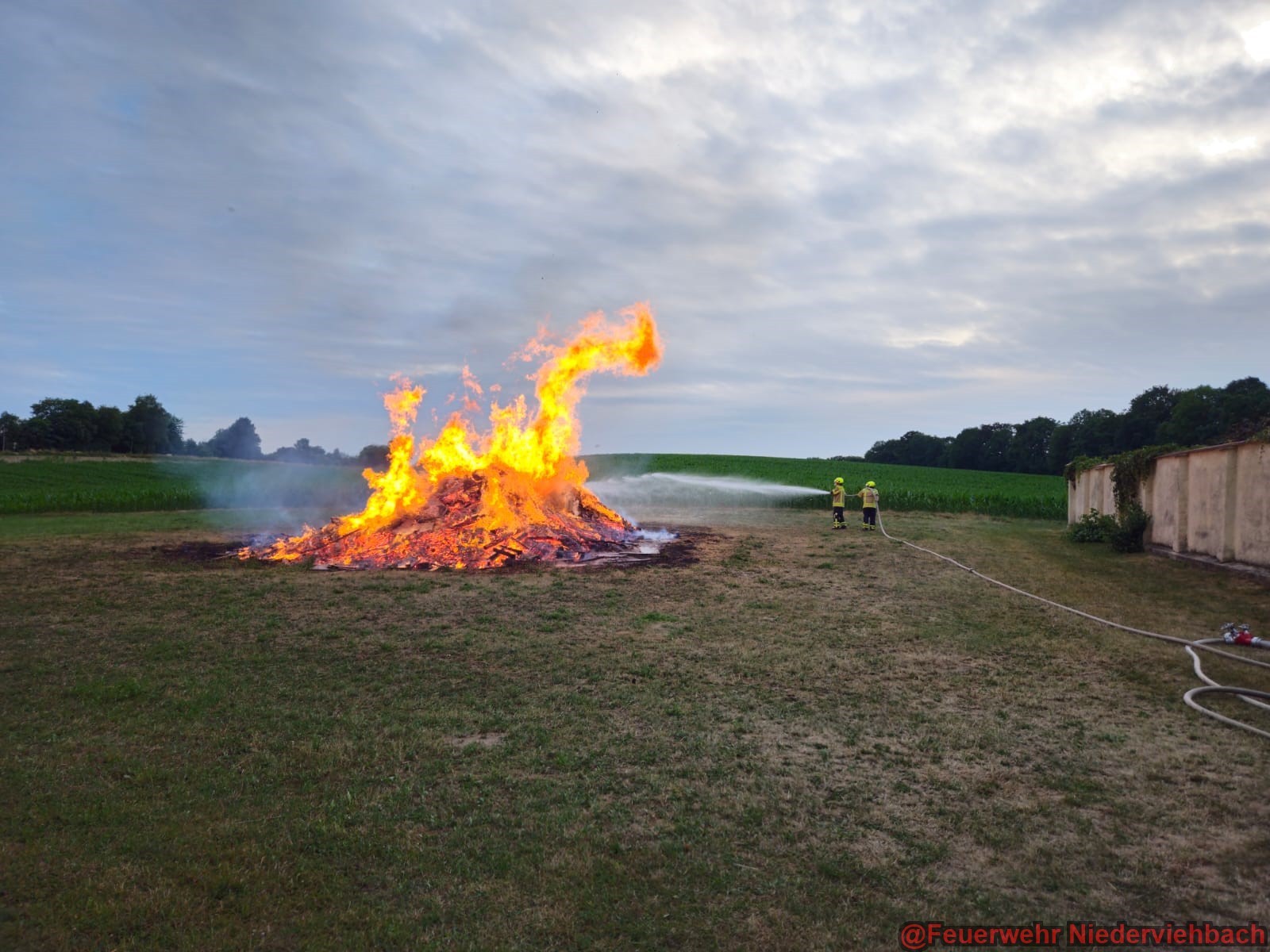 Da am 23.06.23 das Sonnwendfeuer wegen zu starkem Wind nicht abgebrannt werden konnte, wurde das Feuer am 01.07.23 angezündet. Vor dem Entzünden wurde eine Schlauchleitung aufgebaut und die Wiese um das Sonnwendfeuer gewässert. Nach dem Anzünden wurde immer wieder das Feuer eingedämmt.