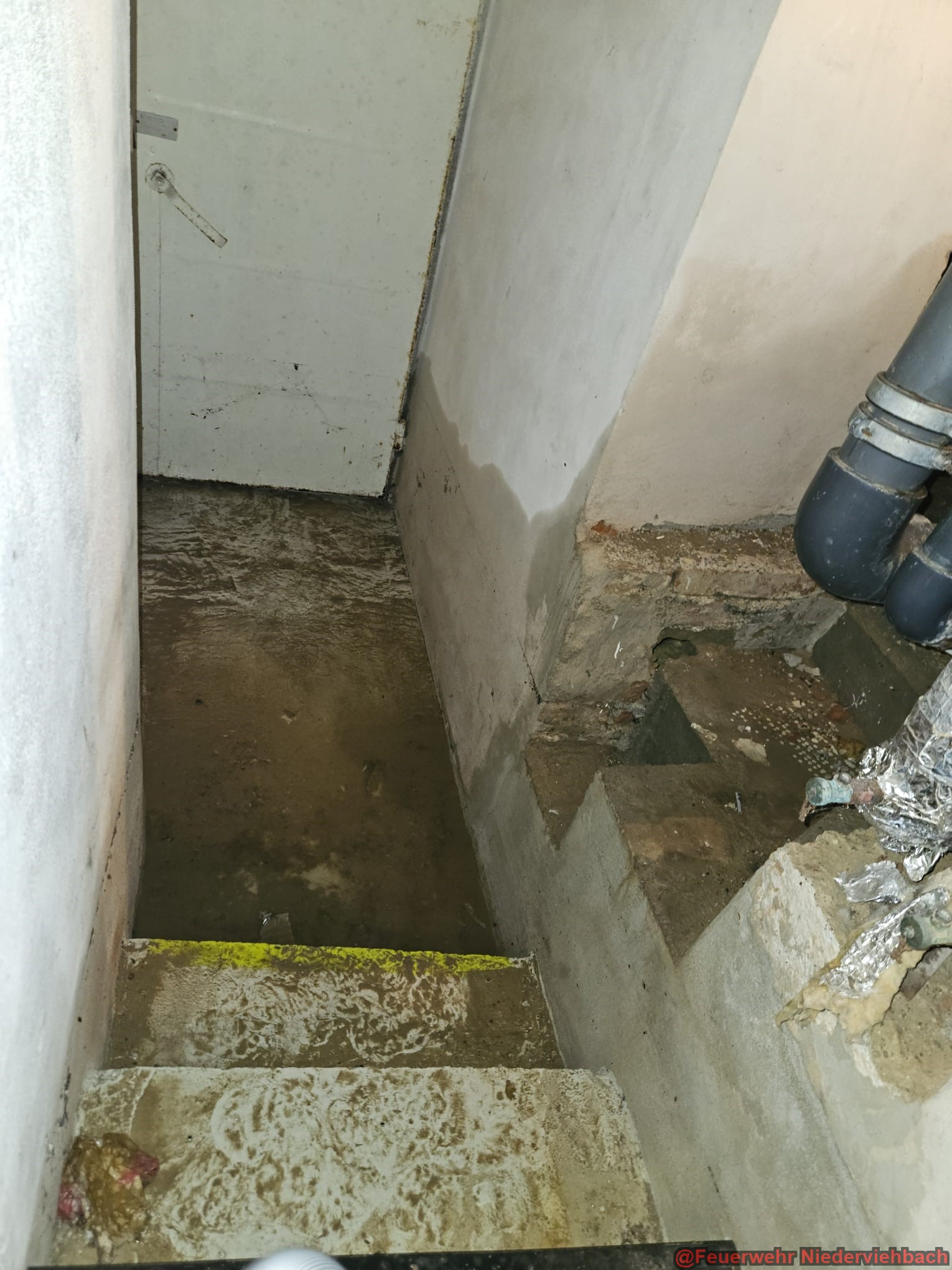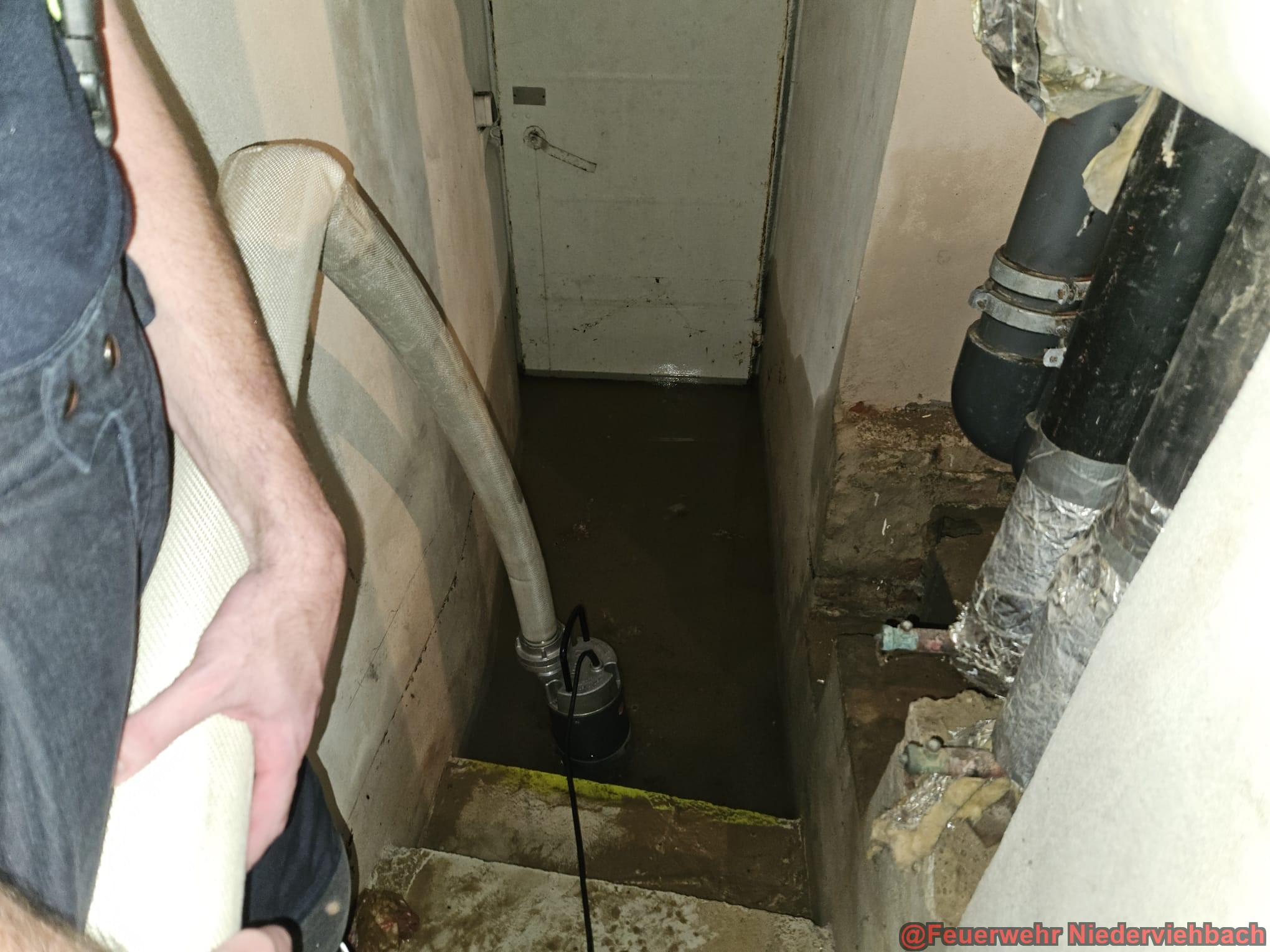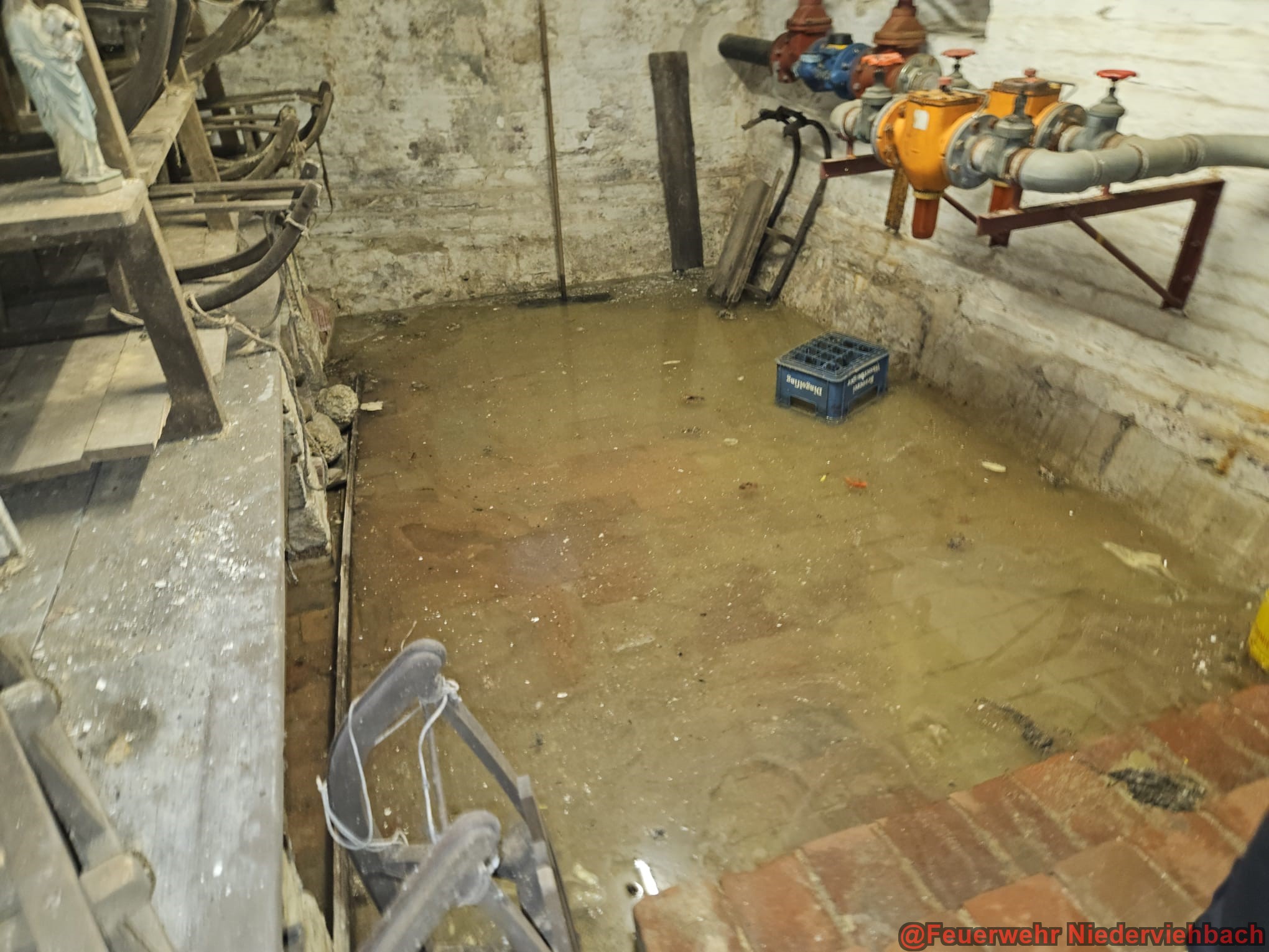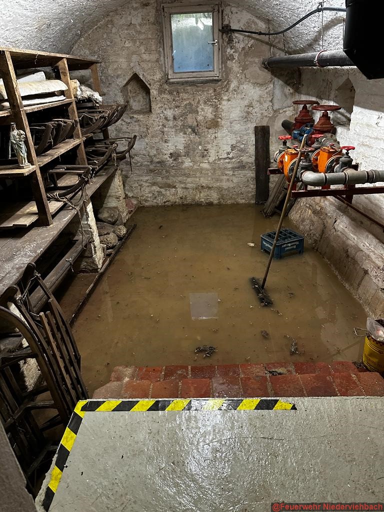 Wegen einem Leck in einer Wasserleitung standen im Kloster in Niederviehbach zwei Kellerräume unter Wasser. Wir pumpten das Wasser mit Tauchpumpe und Nasssauger ab.